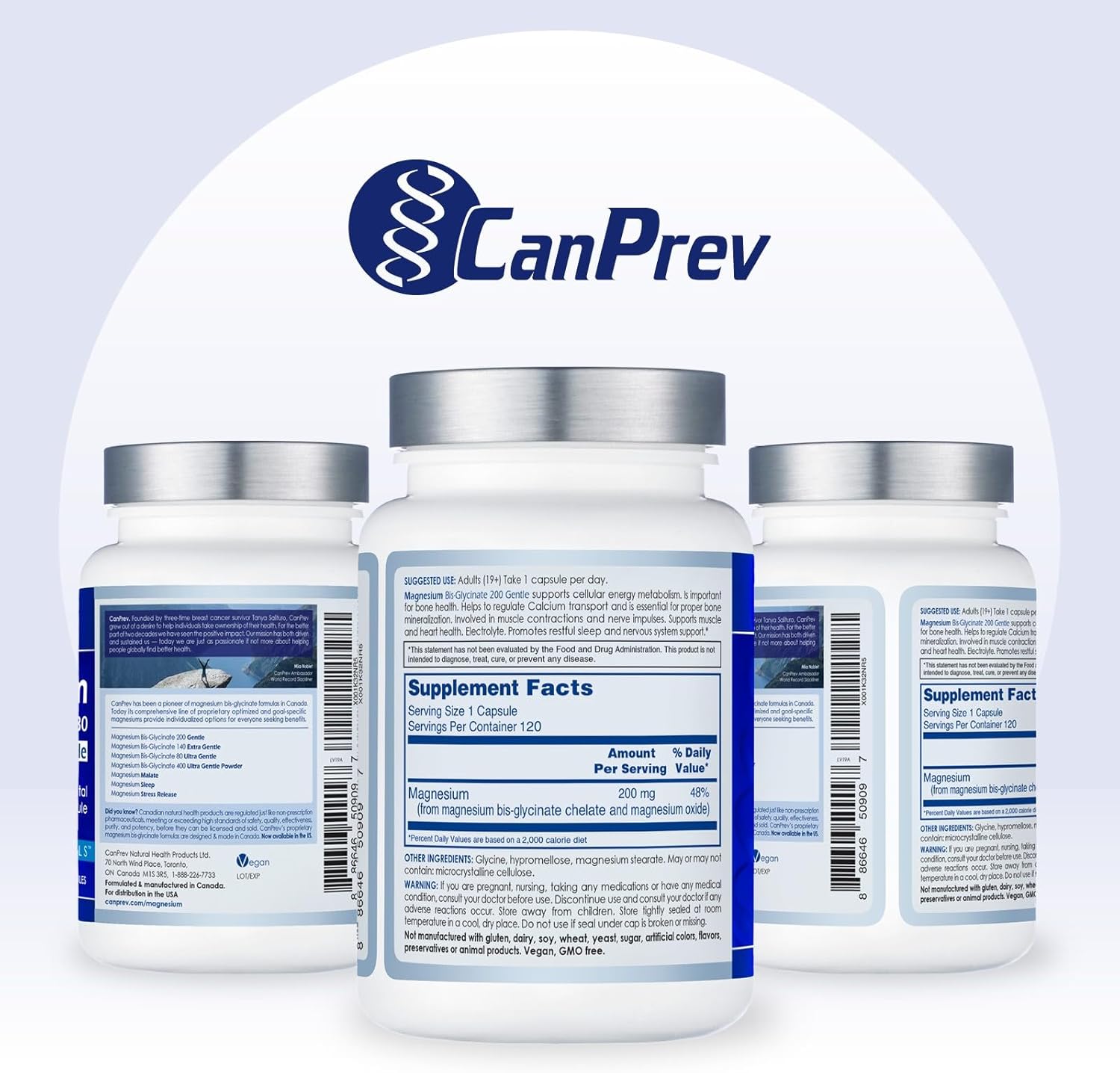 - Gentle, Easily Absorbed Formula: Experience comfort with CanPrev – Magnesium BisGlycinate 200mg, designed to be gentle on the stomach while delivering optimal benefits. This unique bisglycinate form ensures effective absorption, allowing magnesium to support your overall well-being with every capsule. A great choice for those who want to maintain balance and vitality without discomfort.