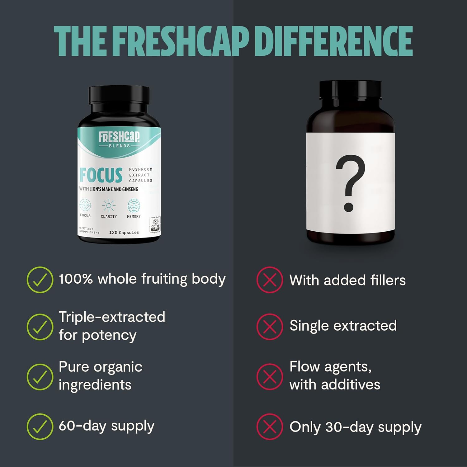 - No Fillers, Pure Ingredients – We use only the highest-quality ingredients, free from fillers, artificial additives, or grains. Our memory supplements feature lions mane extract from 100% whole fruiting bodies, combined with pure ginseng supplement and herbs for maximum brain function.